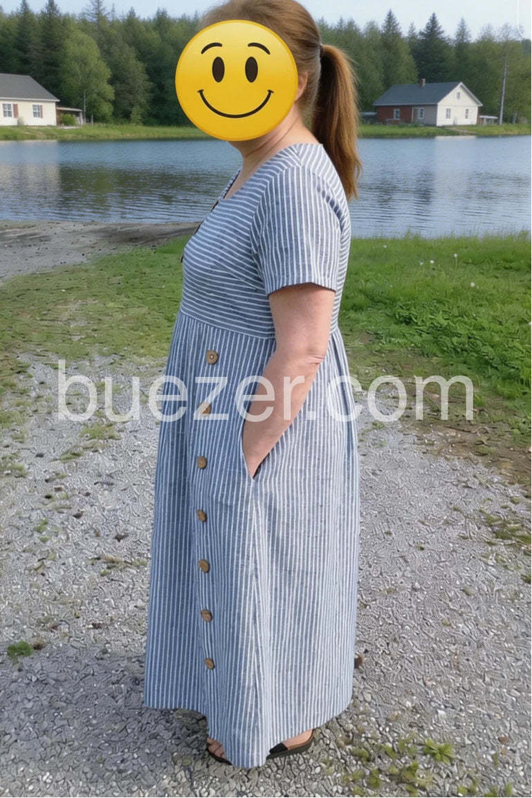 Blue Striped Buttons Midi Dress with Pockets