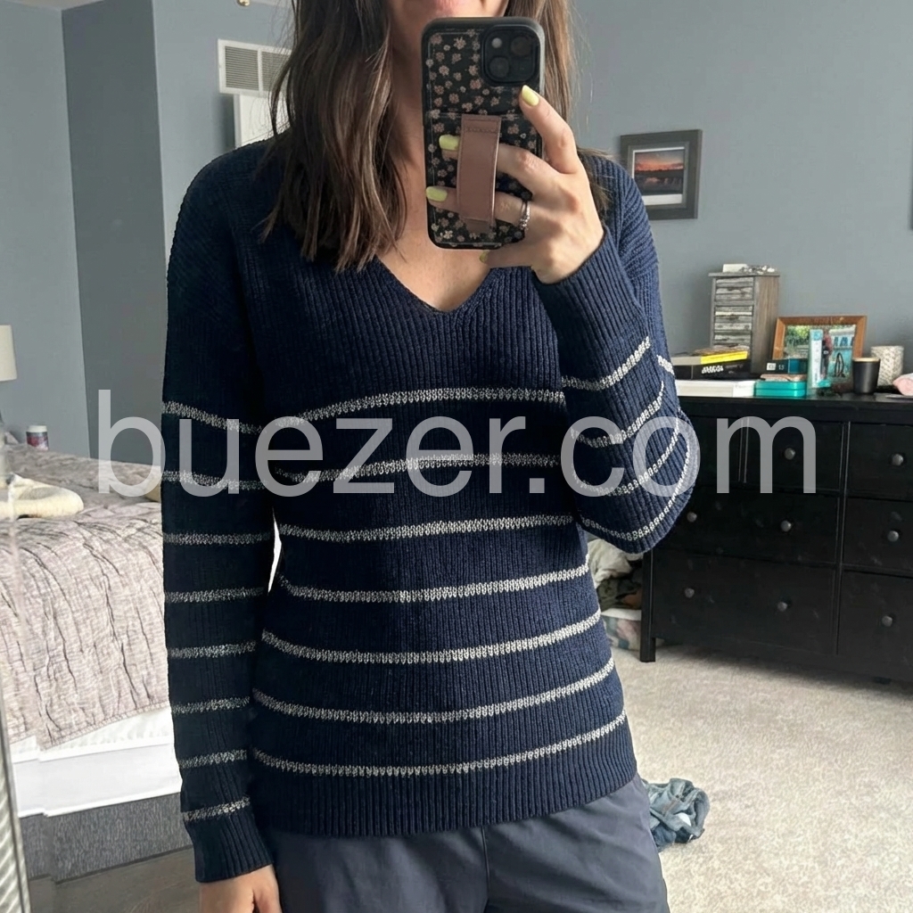 Stay stylish and warm with our Groovy V-Neck Striped Print Navy Sweater. The v-neck adds a touch of elegance while the striped print adds a trendy flair. Made with high-quality materials, this sweater is perfect for any occasion. Upgrade your wardrobe and stay cozy this season.
