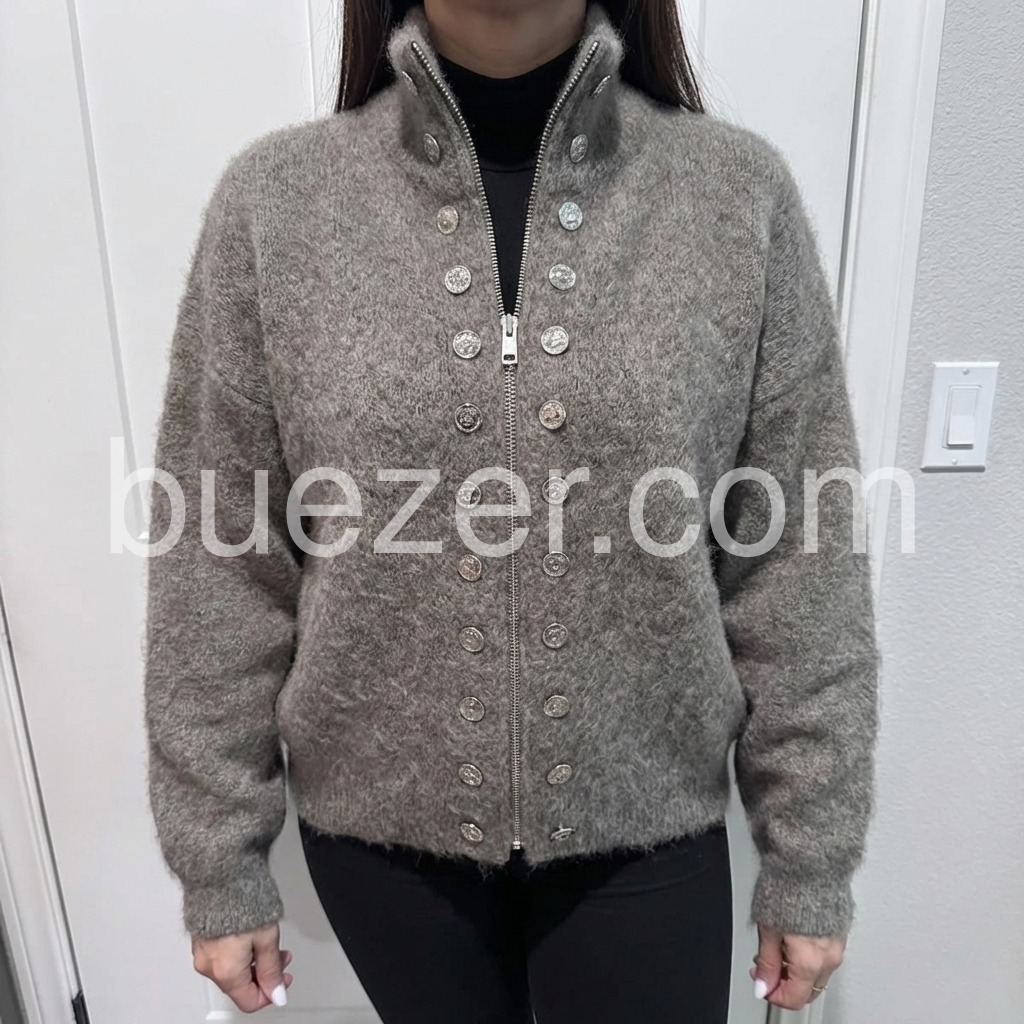 The Fuzzy Grey High Neck Long Sleeve Cardigan is a cozy and stylish addition to any wardrobe. Made with a high neck and long sleeves, it provides warmth and comfort during colder months. The fuzzy texture adds a touch of softness and style, making it a versatile piece for any outfit.