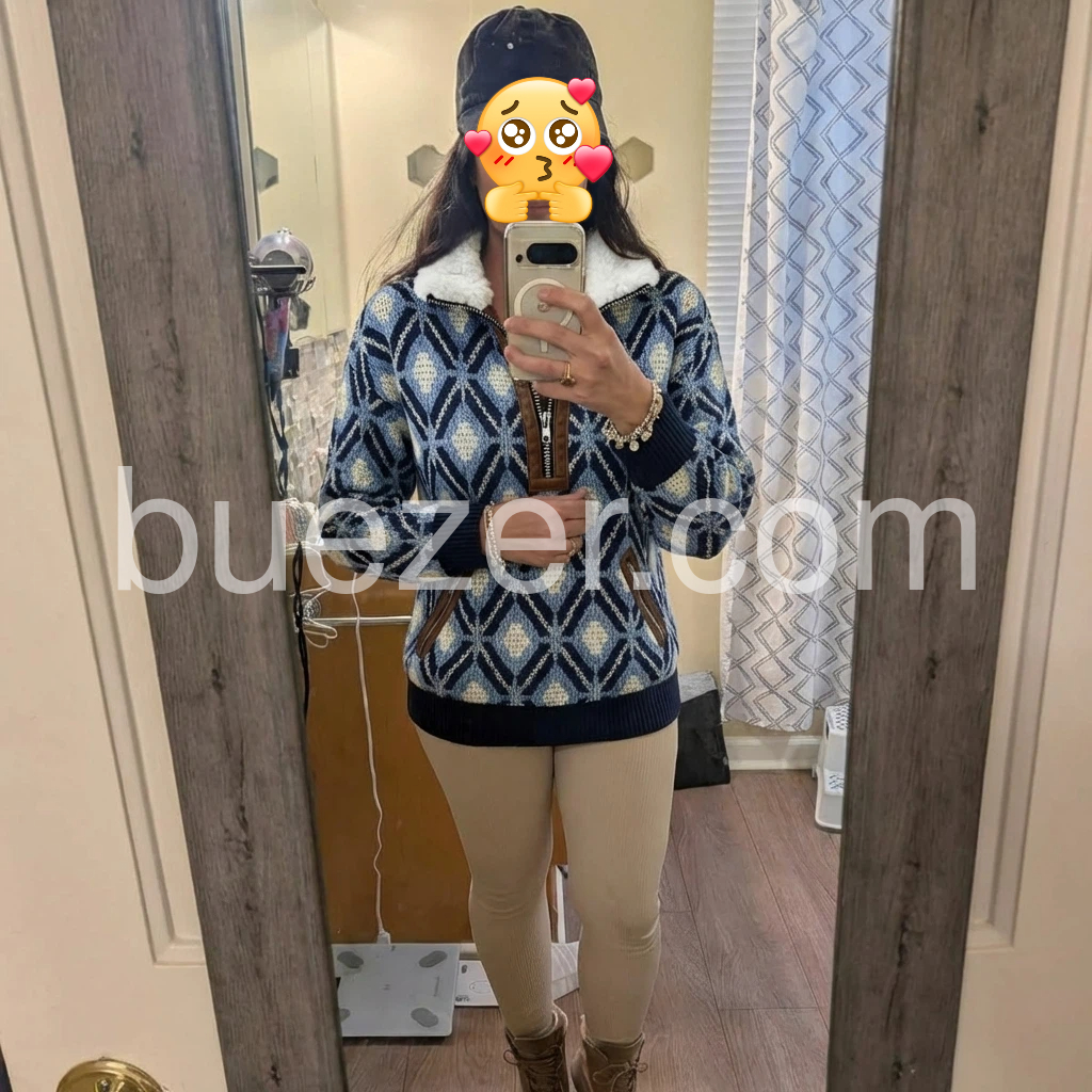 Elevate your cold-weather wardrobe with this sophisticated knit sweater, featuring a striking blue geometric pattern that adds visual interest to any ensemble. The fleece lining provides exceptional warmth and comfort, making it an ideal choice for layering or standalone wear during transitional seasons. Crafted from quality knit fabric, this piece combines contemporary design with practical functionality. The geometric detailing brings modern flair while maintaining versatility—pair it effortlessly with jeans, trousers, or skirts for polished everyday styling.